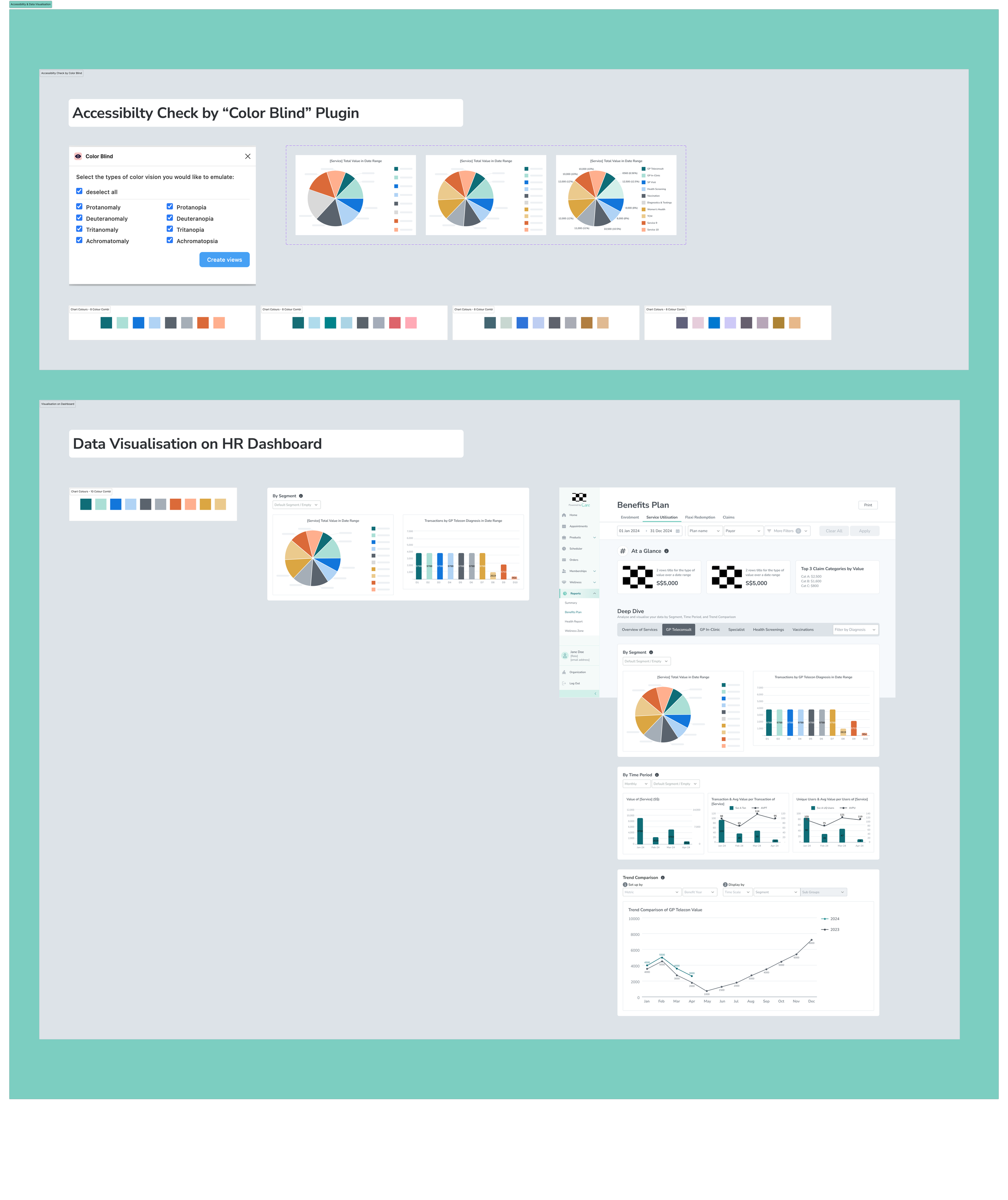 As the lead product designer, I conducted the end-to-end competitive & UX research, Figma designs, colour palette & data visualisation references, and prototypes. Due to lean resources and tight timelines for pitching, the cross functional teams agreed to a hybrid solution where the final proof-of-concept (POC) used embedded data visualisation from PowerBI. This tailored approach meant for more intentional collaboration between the product, engineering, data teams & me to align - The alignment of the visuals like colour and typography & typescale was especially crucial to ensure a consistent look from my Figma designs to the embedded visuals from PowerBI. Some of my high-fidelity designs and prototypes were used for prospective to potential clients, apart from the product development for the POC phase 1.