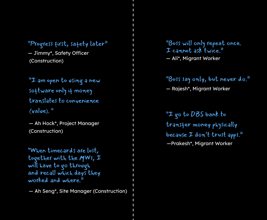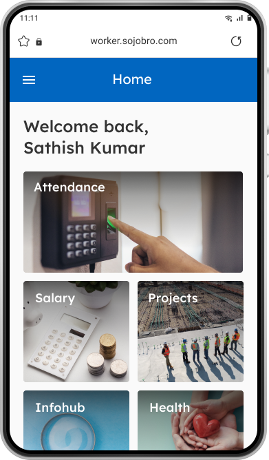 Migrant Workers may have concerns like “Am I signing in to the right workplace”. Their fears of “losing out on their wages” will influence their interaction with Sojourner Manage. We ensured the visuals and information hierarchy were aligned to what they had anticipated (e.g. 2 entry points to sign in their attendance: click "‘Attendance’ or ‘Project’ cards.