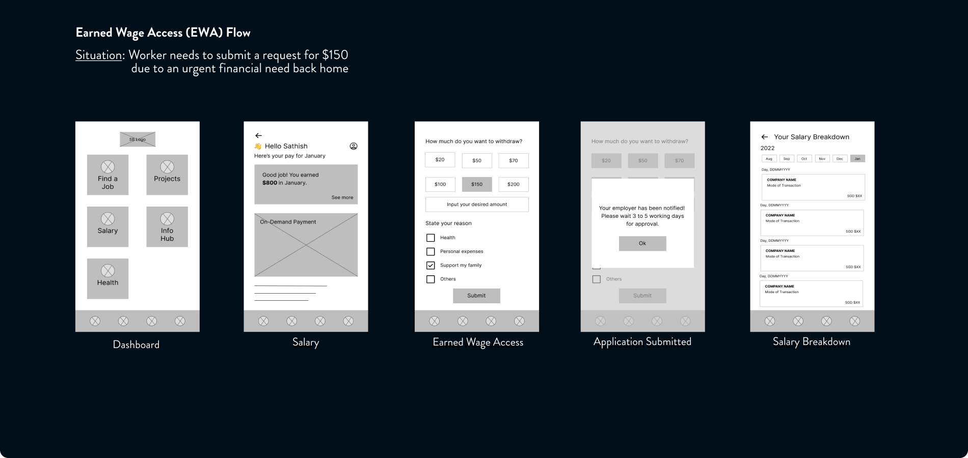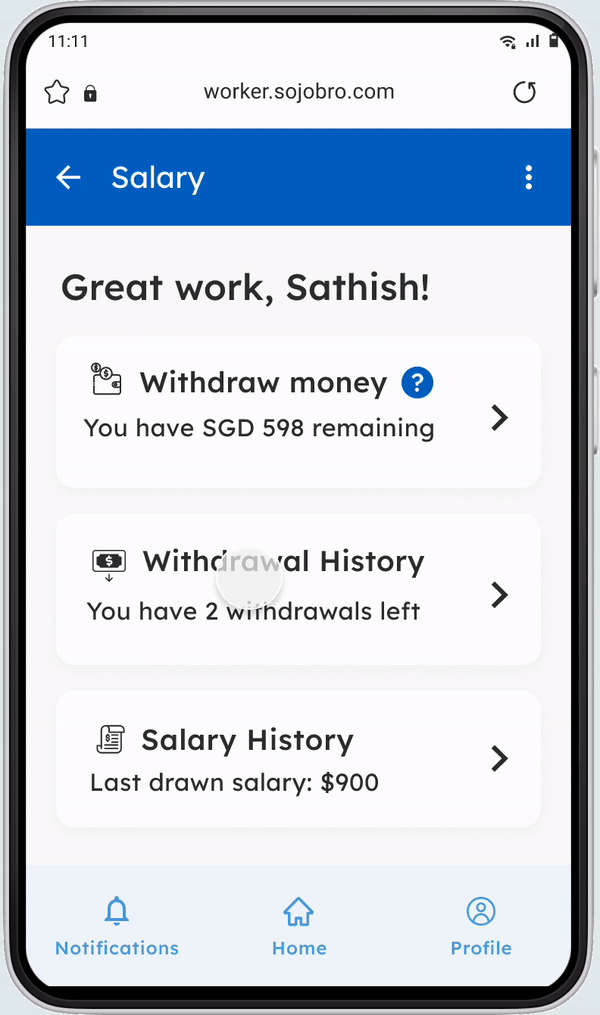 Following UT where workers clicked on their earned wage (e.g. SGD 900) instead of the withdraw button, we learnt to help workers draw the association between the concept of EWA and seeing the monetary numbers of their earned wages.