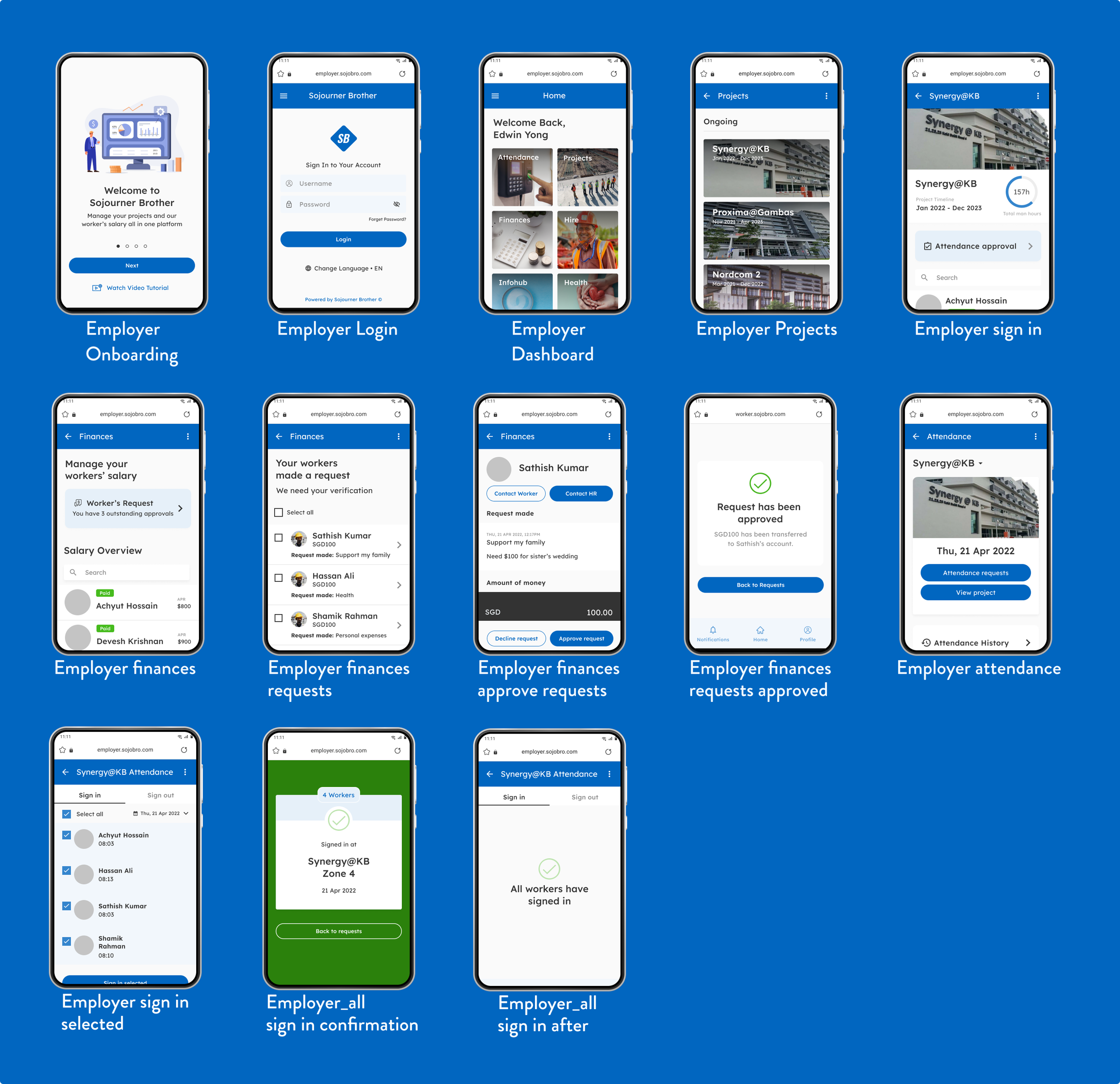 We envisioned an SaaS which would be used concurrently by Employers and Migrant Workers. Moreover they would be using apps in less than ideal conditions at worksites. Hence the visual designs were synchronised on the Employer / Migrant Worker Interface, and had relatable images.