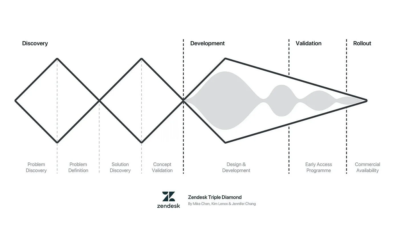 [The overall timeline and processes were more complicated than described due to pitching and business discussions too, but in brief would look like Zendesk’s Triple Diamond Approach]